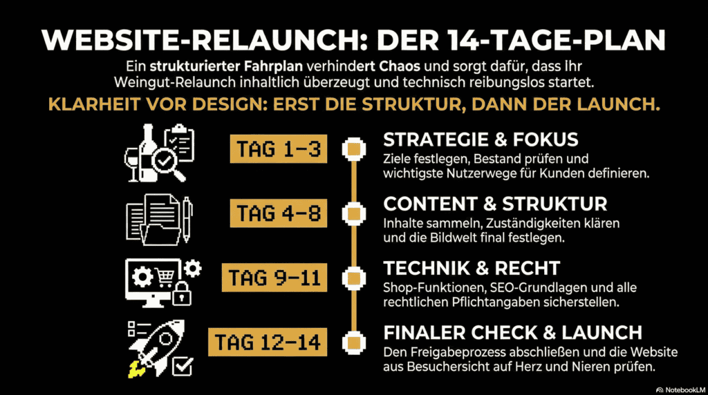 Mit diesem 14-Tage-Plan können Weingüter ihren Relaunch strukturiert vorbereiten – ohne Chaos, ohne dauerndes Hinterherlaufen und ohne das Gefühl, dass alles gleichzeitig entschieden werden muss.